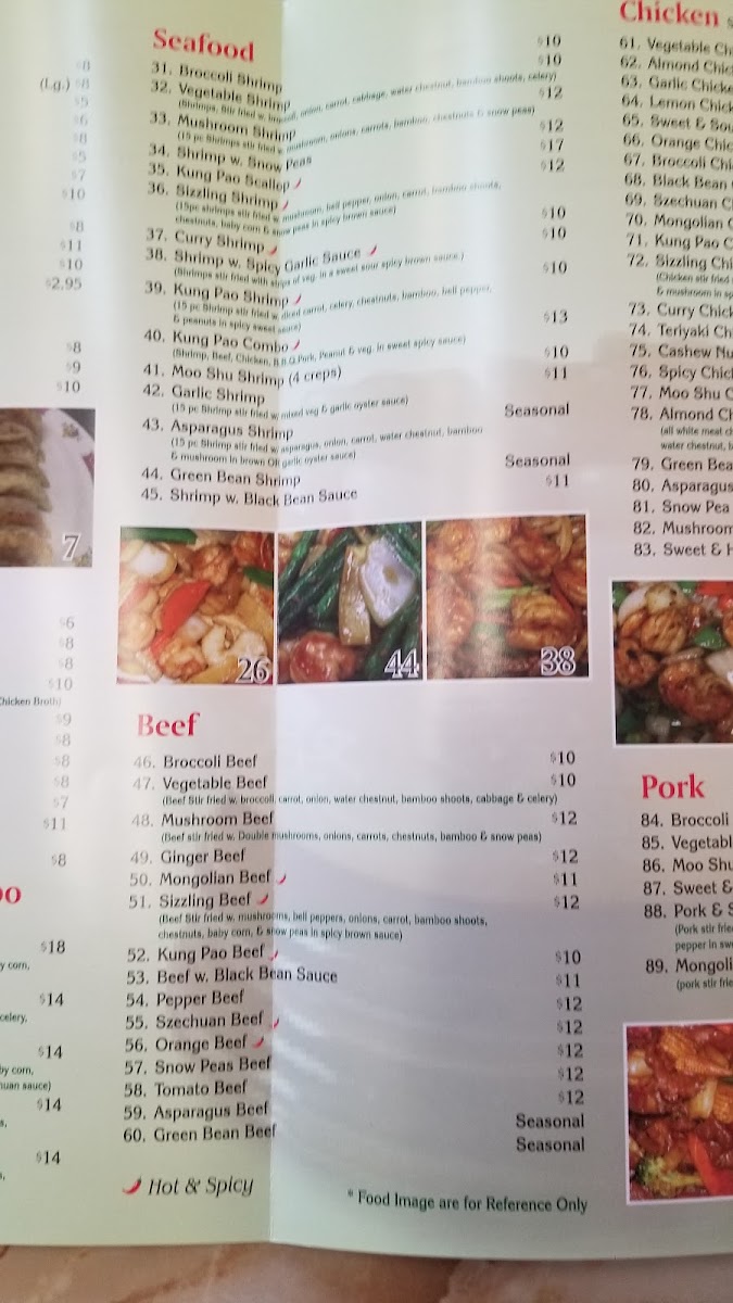 Chicken white meat, beef & shrimps stir fried with broccoli, onions, carrots, baby corn, chestnuts, bamboo shoots, mushrooms, snow peas, bell in spicy Szechuan sauce